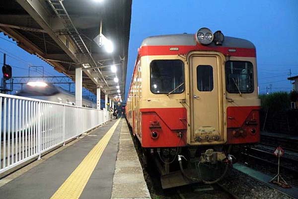 先頃、いすみ鉄道でキハ52が復活運転を始めて話題となっていますが、少し前までは JRでも現役で活躍していました。 その中の一つが米坂線。 オジさん世代は米坂線と 言えば、キューロクの撮影地として記憶に残っていますが、最近ではJR東日本最後の キハ52の聖地でもありました。6月の夕暮れ時、米沢駅の米坂線ホームに佇む国鉄色 キハ52を駅撮りしていたら、横を400系の新幹線「つばさ」が駆け抜けてゆきました。 昭和から豪雪の中を、宇津峠の勾配を、DMH17のデュエットで駆け抜けたキハ52も 2009年3月米坂線の運用から引退、翌年4月には400系も引退となってしまいました。 米坂線 米沢 2008-6 Photo by カモ |