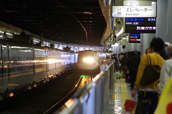 今近頃の駅てぇのは地下駅じゃ無くっても、橋上化だの駅ビルだのと駅全体に蓋を 被せちまうから、ホームに居てもお日様がニッコリとも微笑まないんでございますよ。 ソンナ劣悪な環境の駅でも列車が進入してくると、思わずカメラを構えて仕舞うのが 鉄の性なのでしょうね。しかし、鉄な人を取り巻くデジカメ界の進歩は凄まじいのです。 高感度低ノイズに手振れ補正と、至れり尽くせりの機能装備が今や当たり前となり、 僅かな光源しかないホームでも、お手軽に駅撮りを楽しめる時代なのでございます。 東海道新幹線品川駅もホームの上はビルが塞いで天井は真っ暗ではございますが、 デジカメの力を借りてコンナ進入シーンが撮れたのでございます。700系のライトに 照らされて光るカテナリー、レールに対抗列車、ウゥ〜ム、これぞ光のオブジェっと、 一人悦に入っている我を厳しい現実に戻したのが、セコハン安物ズームの吐き出した グリーンのハレーション二つ。これはもう、PHOTO SHOP様に縋るしかありません。 東海道新幹線 JR東海品川 2010-4 Photo by 団長 |