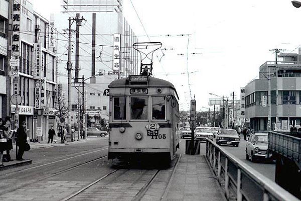 横浜市電が廃止されてからもう40年近く。その2年前の尾上町電停です。尾上町と 言っても地元の方でもなければピンとこないかも知れませんが、現在ではこの下に 市営地下鉄の関内駅があります。それからJR根岸線関内駅もすぐ隣なんです。でも 根岸線の開通の方がずっと新しいので、市電時代は当時の国鉄に迎合することなく、 尾上町を貫いたのでしょうね。現在でもバス停は尾上町のままだと思います。1970年 6月末に2系統(生麦〜本牧1丁目)が廃止されていますので、この写真を撮ったのは 冬の終わりか春先ではないかと思います。しかし、1100系の電車も敵役の自動車も 背景の低い街並みも、ソノどれもが懐かしい〜。 横浜市電2系統 尾上町 1970-? Photo by カモ |
