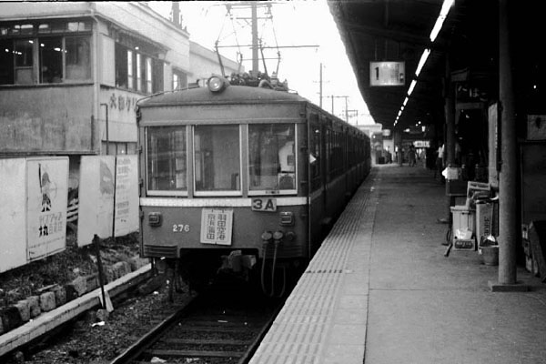 ドメスティックからアジアのハブを目指してへ再び始動し始めた羽田空港。その羽田と 京急蒲田を結ぶ空港線、現在ではエアポート特快・急行が行き交う、本線並ぶ京急の 主要路線となりましたね。京急蒲田も上りホームは高架となり、下り方面も2012年の 完成を目指し鋭意工事中でございます。そんなアクティヴな空港線も京急蒲田も時を 40数年ほど戻せば、ご覧のとおり長閑な支線風景と相成ります。空港線専用ホーム 1番線には最後のご奉公に励む京急戦前の名車デハ230形が停車中、行き先表示は モチロン鉄板の方向版がぶら下がっております。古来から梅に鶯、吊り掛けにサボと 決まり事ある訳なんで、こういう眺めに方向幕なんて無粋なものは論外でございます。 そのサボ、蒲田の上の2文字が京浜なっていますね、右側の羽田空港も名ばかりで、 穴守稲荷近く海老取川に架かる稲荷橋のたもとに在り、空港は遥か彼方なのでした。 そういや、昔は空港線なんて呼ぶやつぁいなかった、ミンナ穴守線って呼んでたっけ。 飛行機なんて、庶民にゃ全く関係ない乗りモンでしたからね。 京急空港線 京浜(京急)蒲田 1968-? Photo by 団長 |