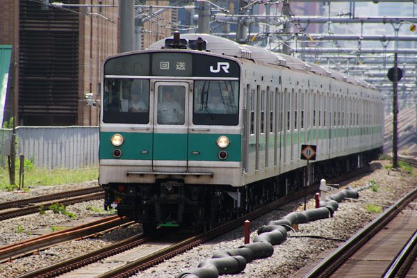 移動して、前編成を何とかカメラに収めたのでございました。そして、この時ホームに いた同業者は3086レを何事も無かった様に見送っていたので、目的を聞くと203系が もう直ぐ外回り線を来るとの事。廃回なのか出場なのかは知らないけれど、コイツも