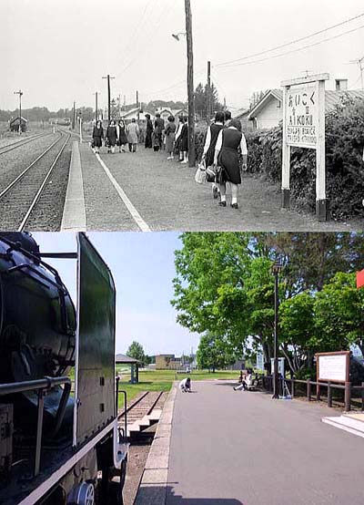 紛れもなく同じ場所からの撮影。キューロクが保存されていて、遙か彼方の幸福駅を 見つめています。撮影した本人のオツムは薄くなりましたが、ホーム先端には木々が 茂ってますね。時間の経過をひしひしと感じさせらたひとときでした。