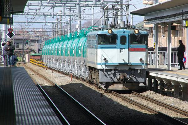 たまにゃ米タンもいいかなぁ、っと思い付きで出掛けた南武線。一様ネットでダイヤは 確認したんだけれど、何処で撮れば良いのか?サッパリ分からず。やがて、多摩川の 鉄橋を通過、此処しかないと思ったけど、府中本町で降りても間に合わないので断念、 もう降りなきゃ対向しちゃうっ、エイヤァ〜で降りた駅がに西府でございました。最初に 来るのは上りの米タンなので、そのまま下りホーム先端へ行こうと思ったら、平日にも 係わらず既にベストポジションには同業者がおりました。止む無く下りホーム最後方に 位置取り、どうせ駅で撮ってんだからホームや屋根が写り込むのは、アッタリマエっと 負け惜しみを呟きながら撮ったのが、貼り付けたカットでございます。駅撮りと言えど、 事前情報の収集を怠るとコンナンしか撮れません。良い駅撮りファンの方々は、決して 思鉄の真似なんかしないで下さいまっせ〜。 南武線 西府 2013-2 Photo by 団長 |