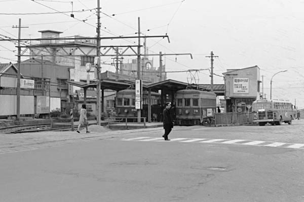 日本の高度成長期の一翼を担った働くオト〜サン達の足として、北九州工業地帯を 門司から折尾まで走っていた西鉄北九州市内線も今では、鉄な人の語り草と相成り 黒崎近辺の筑豊電鉄に栄華を偲ぶのでございます。そこで、今回の駅撮り探検団、 今は西鉄バス戸畑バスセンターとなっている戸畑駅で北九州市内線の栄華を偲んで 頂きましょうか。櫛型ホームに3本の発着線とターミナルの体裁を整えはおりますが、 何処か儚げに感じるのは何故でございましょか。停車中の電車右側は66形78号車、 この78号車は箱を新調してもらえず組で、70年代初頭にお役御免となったようです。 左側の車両は200形202号車、こちらの電車は形式こそ200形ですが、戦前生まれの 66形よりルーツは古く、1911年九州電気鉄道として開業した時に新製された、1形の 足と臓物を利用して箱を戦前に新調したとの事でございます。当然200形も80年代を 待たずしてスクラップとなりました。ピンボケ写真に写っている中で唯一健在なのが、 200形の上に見える旧ニッスイ本社ビル(現ニッスイパイオニア館)なのでございます。 西鉄北九州市内線戸畑線 戸畑 1969-3 Photo by 団長 |
