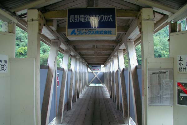跨線橋は、幅の狭い木造トラスに華麗に変身するのです。床板の軋む音を聞きながら 木造の感触を楽しみつつ、屋代線のホームに下りると其処は、期待に違わぬ昭和の