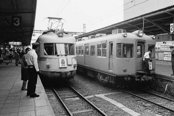 今ではJRに乗降客数を逆転され、岐阜市の中心駅の座を滑り落ちた名鉄岐阜駅が、 新岐阜と名乗って一番輝いていた時代の駅撮りなんぞで、昔を懐かしんで頂きます。 3番線に停まっているのは、愛電から引き継いだ1500V東部線の雄、流線フォルムが 美しい戦前生まれの名車モ3400系。右の2番線には、定期で乗車可能冷房車として 恐らく日本で始めて常時運用に就き、大衆冷房車の先駆けとなった5500系SR車が、 停まっていますね。これで7000系パノラマカーが写っていりゃ最高なんですけどねぇ、 そうは問屋が卸さないのが、この世の中なのです。もっとも、5500系の成功がなきゃ 7000系は製造されなかったんじゃないでしょうか。モ3400が差している大田川行きの 先行板は今じゃ見ること出来ないし、5500系の行き先表示はサボでもなけりゃ幕でも 無い、モチロンLEDでも無い、貫通扉に直接チョークで手書という適当さ。大手私鉄の 名鉄だってこの調子、細かい事なんかにゃ拘らない本当に良い時代でしたねぇ。 名鉄名古屋本線 新岐阜(名鉄岐阜) 1974-6 Photo by 団長 |