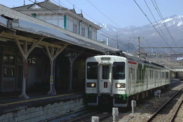 名残雪の高みは帝釈、女峰か男体か、猫眠り猿三匹葵縁の東照宮、馬反し九十九に 折れるいろは坂、登れば漣中善寺出る流れは華厳の滝か、の国際観光地に相応しい 瀟洒な洋風建築のJR日光駅で出発待ち107系が、今回の駅撮り探検団でございます。 乗降人員、列車本数、運用車両の質等々交通インフラとしては、全て東武日光に差を 付けられてしまったJRの日光駅なのです。しかし、がっかりする事はございませんよ、 JRファンの皆さん、東武がシャッチョコ立ちしたって適わないのが、貴賓室まで備えた 築百年を超えるヴィンテージな駅本屋なのでございます。107系の停まっている1番線 ホームの上に2階部分が、覗いていますね。でもこれだけクラシカルな駅舎に3ドアの 107系じゃ合いませんや、ヤッパリここは、青い帯の客車か百歩譲ってキハ55かなぁ、 ナンテ考えていたら、107系も今やオジャンで、走ってんのは銀箱の209系だってさ。 日光線 日光 2009-3 Photo by 団長 |