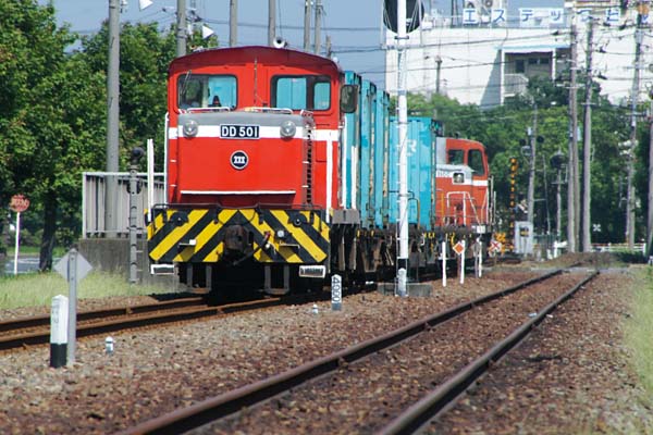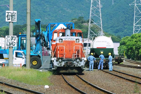 久し振りに御覧頂く駅撮り写真は、ホームも駅舎も無い青空天井、水島臨海鉄道の 貨物専用駅東水島でございます。貨物専用の駅ですから、当然入場券なんてモノは 無く駅構内へ立ち入れないので、パブリックスペースからの撮影が、お約束ですね。 貨物時刻表には載ってないけど、写真の列車は、倉敷貨物ターミナル発東水島経由 多分倉敷から山陽本線に直通するスジで、途中水島でスイッチバックして東水島に 至ったのでございました。そこで、スイッチバックの機回しの手間を省く為に列車は、 編成の前後をカマを鋏んだプッシュプルの形態を採っております。写っているカマは JR貨物のDE10 1100だけですが、最後尾には水臨オリジナル日立製DD50型1号機 DD501が連結されているのです。なので、実際の狙いは水島から東水島に来る時に、 先頭に立つDD50型なのですが、公道からはこのアングルが精一杯なのです。しかし、 これだけDD50と言ったんで、三菱自工前駅撮りのDD50も1枚アップしちゃいます。