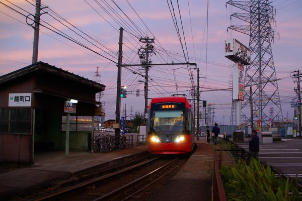 夕暮れの能町口へ到着するは、万葉線ご自慢の低床車MLRV1000形でございます。 軌道法で設置されている、高岡駅から六渡寺間で、能町口と次の米島口間だけが、 専用軌道となっております。旧地方鉄道方で設置された専用軌道を持った六渡寺〜 越ノ潟の交換駅を除く各駅ともに、能町口同様一本の線路を挟んで両側にホームが、 設置され列車の発着方向によって使い分けているのでございます。このホーム配置 って、駅撮りすにゃ実に都合の良いじゃないでしょうか。また、能町口は貨物専用の JR貨物新湊線高岡貨物駅の最寄り駅、入換機の高岡鉄道産業D352や荻布倉庫の スイッチャーが見られる、一部の鉄な人達には、パラダイスなエリアなのでございます。 最新型低床トラムと対照的な木造の古びたホームの待合室、空には無数の電線に 送電鉄塔、私的には、こんなトワイライトな駅風景がお気に入りなのでござます。 万葉線 能町口 2010-10 Photo by 団長 |