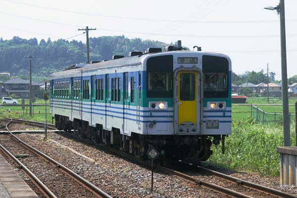 続いて2ドアのキハ37+3ドアのキハ38で編成された下りが、向かい側ホームへ到着。