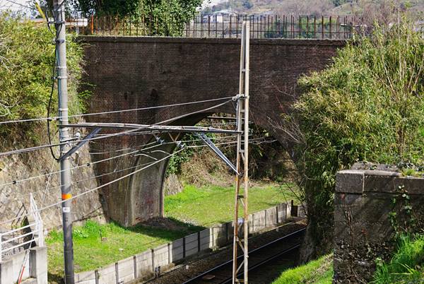 保線基地の尽きる所で線路を跨いでいるのも、またレンガ積みのアーチ橋なのです。
