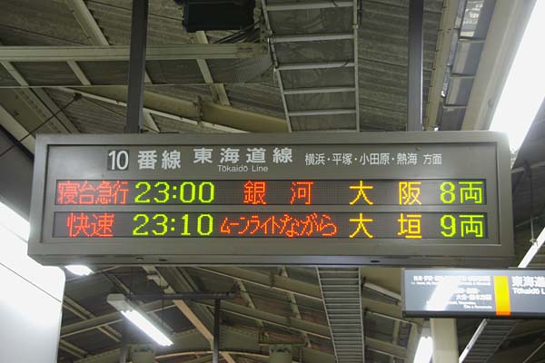 大阪行き寝台急行銀河は23時発、カマも繋がり後は信号が青になるのを待つだけ、 お隣9番線からは、10分後にムーライトながらが出発、って、コッチだって143なんて 贅沢言わないけど、せめて347Mなら嬉しいですけどねぇ。そうなるてぇと発車案内も LEDよりゃアナログパタパタが宜しいようで。なんて事を夢想していると、時計の針は
