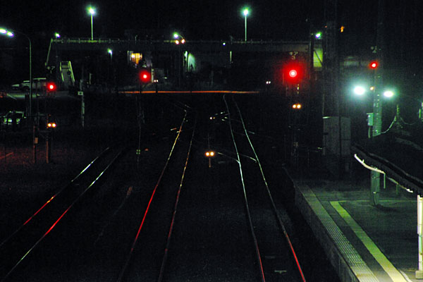 ホーム先端信号機と街路灯、反射で光るレールの他は、暗闇に包まれておりました。