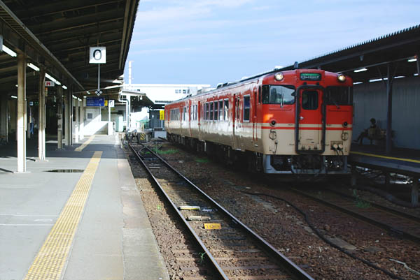 前回は銀塩写真でお届けした、70年代旧高松駅での10・20系気動車でした。そして、 今回の駅撮り探検団は、古い様な新しい様な中途半端なカットをアップしてみました。 ホームに停まっているは、ご存知キハ40系の気動車両開きドアが、近郊区間走行を 示しているキハ47でございます。そして、旧国鉄色を引っくり返した様なオレンジ色と クリーム色の車体色と見ていただければ、姫路駅高架化完成前に撮られた写真だと 分って頂けますね。昔ながらの乗客・荷物・貨物・機関区などの鉄道施設を併設した 国鉄時代からの主要駅が、次々に高架化されて行く現在ならば、それが高架工事の 真っ最中でも、国鉄の面影を見つけたらシャッターを押しちゃうのが、オジサン鉄の 悲しいサガなのでございます。ってな事で、姫路駅高架化完成の3ヶ月前にナントカ 間に合った、1番線岡山側にあった切欠ホーム0番線と通過線に仮ホームを造った 1番線ホームと今では見られなくなった、姫新線姫路口キハ47でございました。 山陽本線 姫路 2008-9 Photo by 団長 |