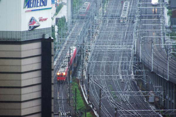 鉄な写真の中でも俯瞰っとくりゃ、チョイット憧れちゃうシチュエーションなんですけど、 山道をエッチラオッチラ登ってなんて、モノグサ思鉄に出来る訳ございません。しかし、 街中バックで良かったら駅ビル俯瞰なんて事が出来ちゃうんですね。エレベーターや エスカレーターで駅ビルに登って撮れちゃう、苦労いらずの駅撮り俯瞰は、思鉄にゃ ピッタシの撮影シチュエーションなのでございます。そんな都合の良い撮影ポイントの 一つが、名古屋駅JRセントラルタワーズ15Fにあるスカイストリートなのでございます。 嬉しい事にこのフロアーは、無料のパブリックスペース、撮影は当然ガラス越だけど、 寒暖雨天無縁で楽しめちゃうのでございます。線路を見下ろして右側にパンすれば、 ファインダーに今は無き新幹線300系が、テレ端(35mm換算)450mmで引っ張る。