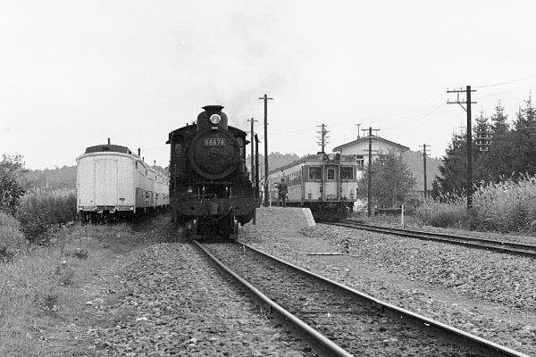 島式ホームの右には急行色キハ55左は大正生まれの8620型蒸気機関車、その隣に ダブルルーフの面妖な客車数両見える、如何にも国鉄時代非電化ローカル線風情が 漂う駅は、その昔ハチロク3重連で思鉄世代を狂喜させた、花輪線は竜ケ森駅での 駅撮り写真でございます。現在では安比高原と駅名が変わり、交換設備も撤去されて 片面1線の停留所になってしまいました。さて、3つ並んだ車両の左のダブルルーフは 当時安比高原スキー場と線路を挟んで対面にあった、竜ケ森スキー場来場客が泊る 施設、真ん中のハチロク機番68678は、正面向きだけど上り列車後部補機なのです。 そしてキハ55ですが、当時花輪線の優等列車は、仙台〜秋田間の急行「よねしろ」と 盛岡〜秋田間急行「はちまんたい」の2本でございました。ところで、運転停車扱いで キハ55が停まっているのは、普通は大館方面用なんですが、当時の時刻表を見ると 下り急行2本とも時間が合わない気がするのです。ネガの並びから合いそうなのは、 11:37発上り「よねしろ」なんですけどねぇ。でもハチロクも上り貨物レだし、花輪線で 優等列車の追い越しなんてスジが、あったんだろうか?メモとってりゃなんでも無い 疑問なですけどねぇ、撮りっ放しが45年の時を隔てて影響する、モノグサな思鉄です。 国鉄 花輪線 龍ケ森(安比高原) 1970-10 Photo by 団長 |