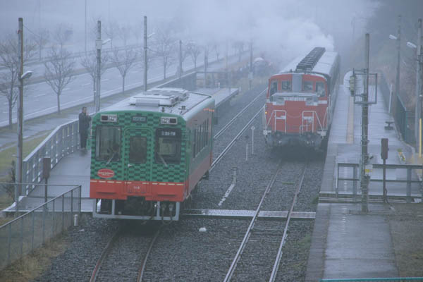 8年ほど前の冬に行った真岡鉄道、その日最初に撮った折本駅上り側に架かっている 歩道橋からのスナップが、今回の駅撮りでございます。雪が降るほど寒かぁ無いけど 氷雨上がって白霧に包まれた写真撮るにゃあまり宜しくない空模様ではございますが、 モノは考えよう、滅多にない霧中の鉄も良い経験と、開き直っての撮影となりました。 ホームにはC12を後ろにぶら下げた、DE10先頭のもおか号送り込み列車が先に入線