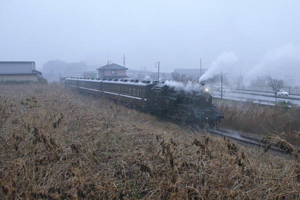 やがて、もおか号送り込み列車が下館に向けて出発、DE10の赤い機体が白い霧に 消え掛かるると、本日のお目当てC12 66号機が、目の前に現れたのでございます。 以上、霧中真岡鉄道折本駅列車交換模様之御報告也。 真岡鉄道 折本 2008-1 Photo by 団長 |