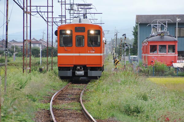 去年(2015年)の秋、久々の寝台列車の旅で降りた出雲市から一畑電車に乗り換え 川跡経由で降りたのは、鳥居ポイントの最寄り駅高浜でございました。先ず撮影地に 向かい、取り合えず当初の目的を果たして駅へ戻り、乗車列車の入線を撮ったのが 今回の駅撮り写真でございます。駅周辺は田畑と住居が混在する、地方都市近郊の 典型的な田園地帯で見通しも良く、何処からでも其れなりに列車撮影可能だけれど、 鳥居ポイント以外はコレといったモノが無い中、駅のホームから川跡方面にレンズを 向けると、進入してくる御当地最新鋭の元東急1000系と戦前電化時に自社発注され 最後は大社線で引退した、生え抜きデハ1形の3号車+6号車静態保存車との並びが、 簡単に撮れちゃいました。それにしても、何もしなけりゃ無味乾燥な銀箱の1000系に 手動ドア吊り掛け車色を模したラッピングをするなんざぁ、一畑電車も粋ですね。 一畑電車大社線 高浜 2015-9 Photo by 団長 |