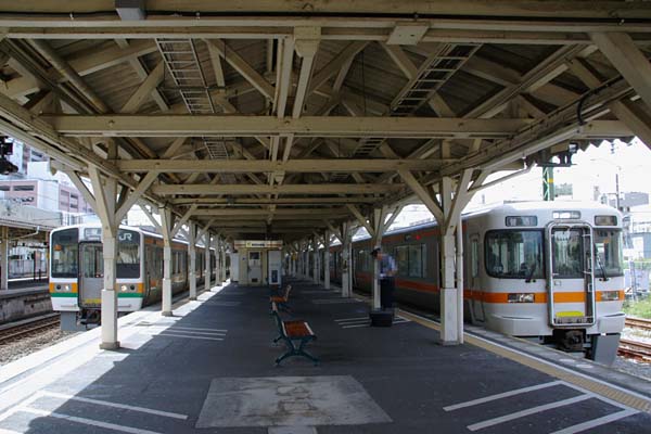嵩上げを繰り返したホームの上屋は、木製の梁と柱がキッチリと支えているのです。 しかし、このホームにゃ313系や211系じゃチット役不足、ヤッパリここは80系かなぁ。