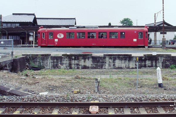 今回も懲りずに一昔前銀塩シリーズ、くりはら田園鉄道廃止前の石越でございます。 3セク化で非電化になった くりでん の先行きが、怪しくなってきた2004年に一度だけ 訪れた時、JRのホームから撮ったKD95型気動車KD953です。チャームポイントは 貫通路の上に設置された、カンテラをモチーフにしたヘッドライトなんですけど、この 写真じゃよく判んないっすね。来年(2017年)で廃止されてから早10年となるけれど、 嬉しい事に駅撮りしたKD953は、KD951と共に旧若柳駅に設置された、鉄道公園に 動態保存されており、2010年より定期的に乗車会を開催しているそうです。しかし、 架線に電流が流れていた、栗原電鉄時代に一度だけでも来るべきだった。 くりはら田園鉄道 石越 2004-5 Photo by 団長 |