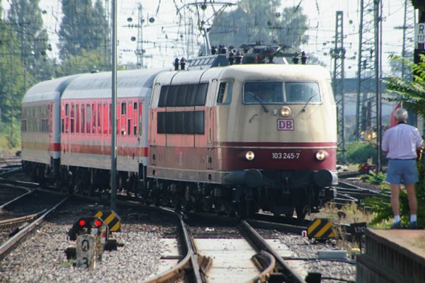 駅撮り探検団十年一昔前シリーズ、今回は洋物でございます。スイスに着いて1泊後、 バーゼルよりICEに乗り込みドイツのマンハイムまでやって参りました。マンハイムは 北行フランクフルト方面とラインルール方面、南行はスイス、シュトゥットガルト方面が、 同一ホームで乗り換えられる、DB長距離高速列車網の重要ジャンクションなのです。 でも、アッシがマンハイムで降りたのは、ここからライン川の支流ネッカー川に沿った 支線を経由してハイルブロン行く為なのでございます。ハイルブロン行きRE出発まで 駅撮りでも思って南行方面を見ると、鉄らしきオッサンがホーム先端でカメラを構えて いるじゃありませんか。そして、その先にはナント!IC用客車の先頭に立ち迫り来る 103型電気機関車、2003年に惜しまれつつ定期運用を外れた筈の名機103型ですぜ。 しかし、間に合わなかったのです。ホーム先端の絶好ポジションと思われる位置まで。 結局、撮れたカットは、ホームの途中から無理やりシャッター押した、こんな情け無い カットが、精々なのでした。高い飛行機代払っても、18切符でもやってる事ったぁ同じ、 地球上何処へ行っても適当鉄の思鉄でございました。 DB KBS No.700 Mannheim Hbf 2006-9 Photo by 団長 |