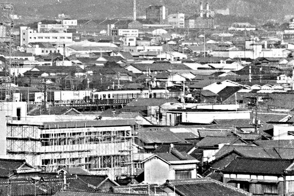 行方定まぬ駅撮り探検団、前回は三次元空間移動にてDBはマンハイム中央駅での 駅撮り、そして今回は47年の時空間を遡った、西国のインターアーバン西鉄電車は、 平尾の駅撮りならぬ’駅を撮り’でございます。甍の波の間に間に見え隠れしている、 ホームに停まっているのは20系でしょうか?臓物の方は使い回しの吊り掛けながら、 新造した湘南フェース3両固定編成の車体が、チャームポイントの一寸小粋な車両で したねぇ。しかし、筑肥線をオーバークロスする為の築堤上に設置された、平尾駅を やや俯瞰アングルで撮ったこのカット、当時泊まったホテルの部屋から撮った記憶が 微かにあるんですけど、グーグルマップで調べても確認できないのです。駅名の方も 画面右上に見える2本並んだ、煙突の所にある看板にアサヒビールの字を読み取り、 右中程に微かに見えるカマボコ屋根と合わせ、ようやく西鉄平尾と判明したんです。 西鉄(天神)大牟田線 平尾 1969-3 Photo by 団長 |
