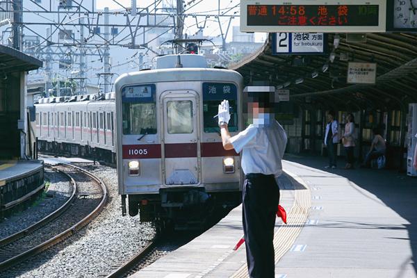 東武東上線の始発駅池袋から二つ目の下板橋は、駅撮りの有名撮影地だそうです。 通常ホーム先端から進入を狙うのが、駅撮りの定番なんだけど、此処のポイントは、 上りホーム最後部から改札口に降りる階段より上り列車を撮れるので、視線が下り 地平で撮る風アングルの駅撮りが、人気だそうです。ならば、アッシもそのアングルで 最後の原型顔の8111Fを撮ろうと出掛けたのでございました。先ずは急行の運用に 入った8000系を鶴瀬で撮り、折り返しが成増となったのを確認して、その上り列車を 下板橋で頂きって胸算用で降りたら、階段は同業者で満員御礼となっておりました。 ならば、駅でしか撮れないカットをてんで、見渡すと目に入ったのが、TVモニターやら ガードマンに頼りきっり、近頃は滅多に見かけない駅員さんが、ホームで列車進路の 安全確認仕業中でございいました。やはり目視こそ安全輸送の原点なのだ、ってな 事を再確認させられた駅撮りとなりました。 東武東上本線 下板橋 2011-6 Photo by 団長 |