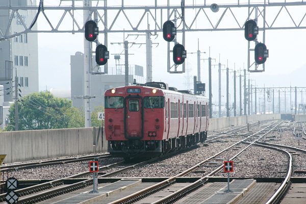 前に米子の駅撮りをアップした時、高架になった鳥取を愚痴っちまったけど、今改めて その時撮った鳥取の駅撮りを眺めるってぇと、コレが中々好いのです。モチロン写真の 撮り方が、上手いからなんてこたぁございません。駅の造りは、大都市圏の主要駅なら 何処にでも在る無機質なコンクリート魂の高架に島式ホーム2面4線ですが、高架駅に なったのは早く、国鉄時代だった為に貨物列車発着用の中線が2・3番線間に、山側に 留置線が在り、コレラの存在が他の高架駅と一味違う雰囲気を醸し出しているんです。 そして、決定的に違うのが非電化って事なのです。高架=電化区間ってなイメージが、 アタマに刷り込まれているアッシにしてみりゃ、極めて新鮮な駅風景なのでございます。 そんな高架駅にはキハ40系、横梁から下がっている出発信号も好ましいのです。 山陰本線 鳥取 2015-9 Photo by 団長 |