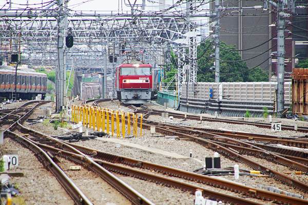 我が視界に入り、一番右端の山手貨物線内回り線を直進して、一番線を通過しようと する処を流し撮りっと思ったけど、その度胸も技量も持ち合わせなく、無難にサイドを 駅撮りして、この日の新宿駅撮りを終りました。そして、いつの日か必ずEH500流すと 心に誓ったけど、それから10数年今も流せて無いんです。 山手線 新宿 2014-5 Photo by 団長 |