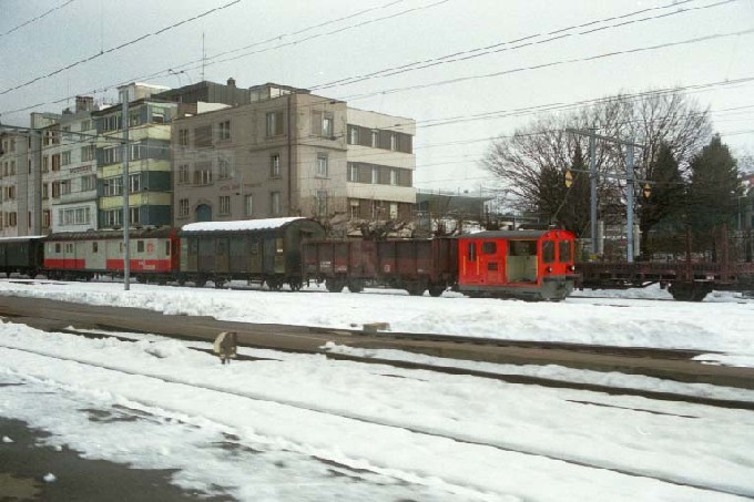 Interlaken-Ost に到着する車窓からの撮影、入換えに活躍中のディーゼル入換機、日本だと殆ど、