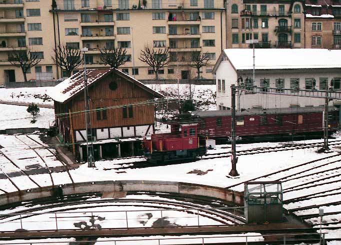 Luzern の機関区の風景を車窓からスナップ、ターンテーブルの上方に見えるのはSBBの入換機、