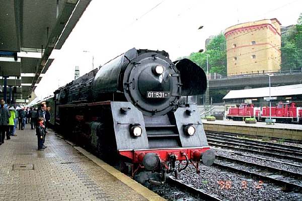 イヴェント列車の終着コプレンツ中央駅に到着した01、ボイラーがナントも太い。