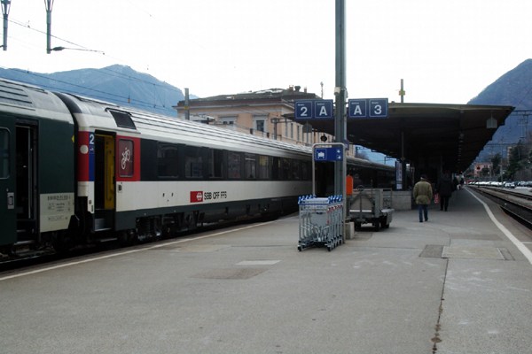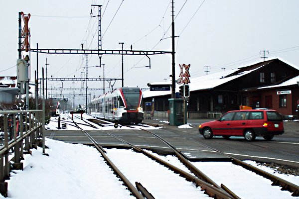 この鉄道はFLP(Lugano-Ponte Tresa Railway)と言ってLuganoから12km南西にあるPonte Tresaの町まで行っているメーターゲージ地方私鉄です。いかにもイタリア語圏らしいニコチャンマークの電車はこの私鉄の主力Be 4/8で、この他古いタイプの車両もあるようですが、乗る時間が無く見ることは出来ませんでした。実はLuganoから2,3駅先で線路がLugano湖を築堤で渡るところがあり、そこで写真を撮ろうと思い現地に行ったけど湖面を吹く風が強く寒く、トテモじゃなけど耐えられず、対抗列車がすぐに来たので迷わず乗車、LuganoでICに乗り換え再びアルプスの北側へっても、来た時と同じ線区を戻っても詰らないので、Luzern経由で帰ることにした。幸いにも乗ったICはLuzern経由SBB Basel行き、ここまま乗り換え無しでLuzernまで行けるので、ほぼ爆睡状態でLuzerunへ到着。ここから支線に乗ってLenzburgに行きそこからチューリッヒまで戻ることにする。 |
