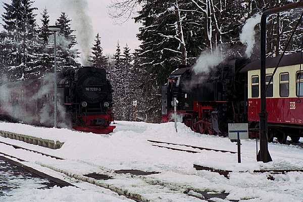 蒸気機関車同士の交換、静かな駅が賑やかになる