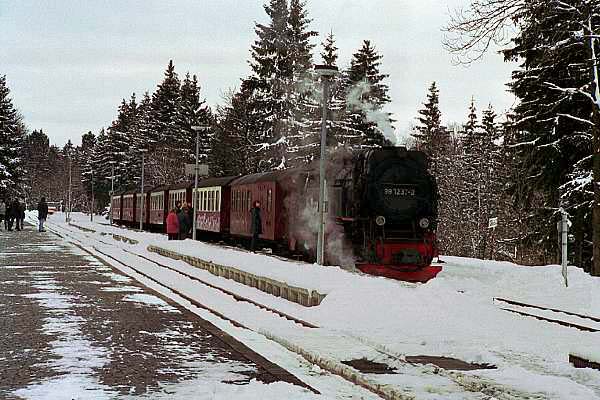 カーブがきつい為か、車長が短いオープンデッキの客車を牽くナローの蒸気機関車