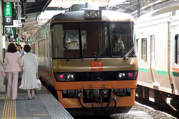 毎度お馴染み、HMならぬヘッドシール。JR東日本のジョイフルトレインの「こがね」。 この時は、仙台−気仙沼の「こがねふかひれ号」として運転されていました。初めて 「こがね」を前面から見た時は「新型気動車か?」と思ったのですが、側面にまわると 窓の形になにか見覚えが ・ ・ ・で、形式はオジサン初耳のキハ59なるものを名乗っ