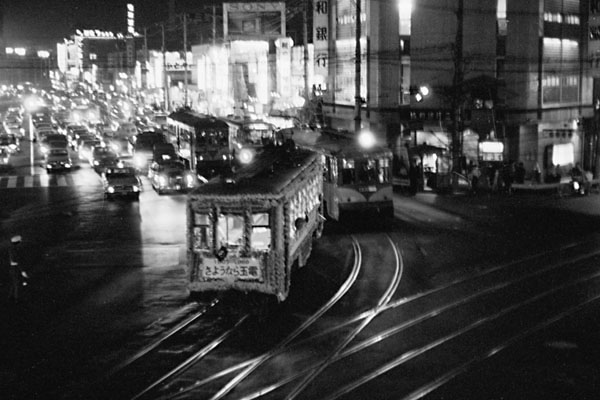 コンナ写真しか残っていなんで御座います。って端から泣き言並べてご紹介のHMは 廃止から41年、オジサン鉄には涙が出るほど懐かしい玉電、その営業最終日の夜、 三軒茶屋ジャンクションを玉川方面に向かう「さよなら玉電」のお別れヘッドマークを 付けたデハ60形装飾電車です。首都高なんか影も形も無いこの頃の246、今よりも 広く感じられませんか。だけど、いくら広くったって、コレだけ車がウジャウジャいたら そりゃ所要時間も掛かりまさぁな。軌道内も一切関係なく玉電にまとわり付いてきた、 車・クルマ・くるま、高度成長に脇目も振らずまっしぐらの当時日本ではクルマの方が 路面電車よりエライと言う考えが、まかり通っていた時代なんですね。時は移り玉電 廃止から8年後に開通した新玉線→田園都市線も今じゃ関東私鉄1・2を争う混雑度、 ラッシュ時間29本/hの運転本数も焼け石に水状態。新玉川線を開通させても玉電を 廃止せずに、軌道内にクルマ乗り入れ禁止にして運行していたら・ ・ ・ なんて思う 今日この頃なんです。 玉電(東急玉川線) 三軒茶屋 1969-5 |