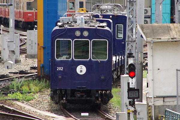 今年もHM探検団宜しく御贔屓のほどを、ってご挨拶しながら、端からインチキHMで 御免蒙ります。新年早々言い訳がましく登場は阪神電鉄の電動貨車202形「工事」。 客扱いしない事業車ですから「工事」は当然先行板ではございませんネ。でも、こんな 車両がホームに停まっても乗る人なんて間違っても居ないと思うけど、何でご丁寧に 「工事」なんて札をぶら下げているんだろう。この202形、後ろに微かに見える相棒の 201形と共に、何時でも尼崎のホームから望遠で撮れる所がネグラの様子なんです。 普通コノ手の事業車というと、庫の中とか留置線の奥深くなんかに留められていて、 中々お目に掛かれないのが常なんですけど、阪神は嬉しい計らいをして呉れますね。 でも、贅沢言えばパンタ上げて働いているとこを見たいなぁ〜。 阪神電鉄本線 (阪神)尼崎 2008-8 |