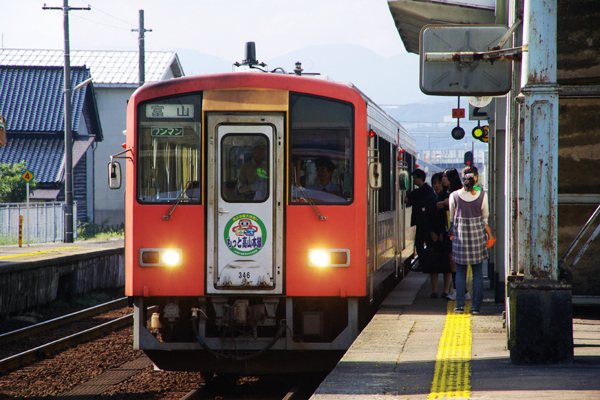 毎日地域輸送に勤しむキハ120に貼り付いているのが「もっと高山本線」と言う、真に 趣旨の宜しいヘッドマークでございます。「もっと高山本線」っと書いてはありますが、 なにも高山本線に並行して採算無視した新幹線を、オラが郷土の政○家先生などが 票田開発の為に造ろうとしている訳じゃありませんよ。富山〜猪谷で運行本数増便と 西富山〜速星間に臨時駅婦負鵜坂を設置し、高山本線を活性化しようとする、実に 価値ある富山市の試みで付いたヘッドマークなんでございます。2006年から始めた この試みも今年の(2011年)3月ダイヤ改正をもって終了なんですが、臨時駅だった 婦中鵜坂は存続、増便された運行本数もほぼそのままに落ち着き、ダイヤ改悪とは ならず、実験成功で目出度し目出度しですね。 高山本線 速星 2010-10 |