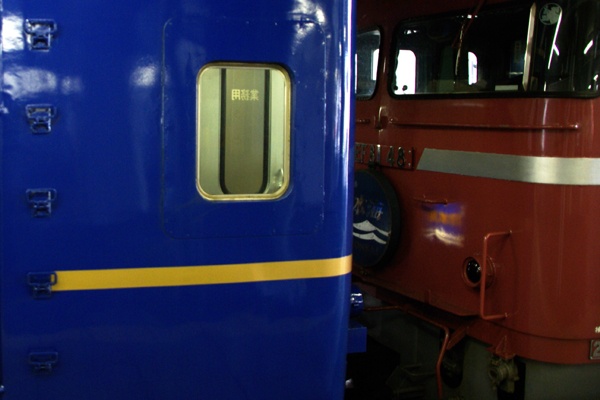 24系客車との連結部を見ると、律儀に見えないこちら側にもHMを付けているんですね。 また、EF81の車体に反射して見えるオハネフ24の「日本海」のマークも宜しいようです。