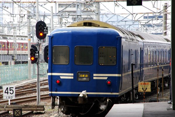 やがて、信号が「青」に変り、テールマークを見せながら「日本海」は、大阪に向かって 出発、連結器の上に載った雪の塊がなんとも印象的でございました。 東海道本線 京都駅 2009-2 |