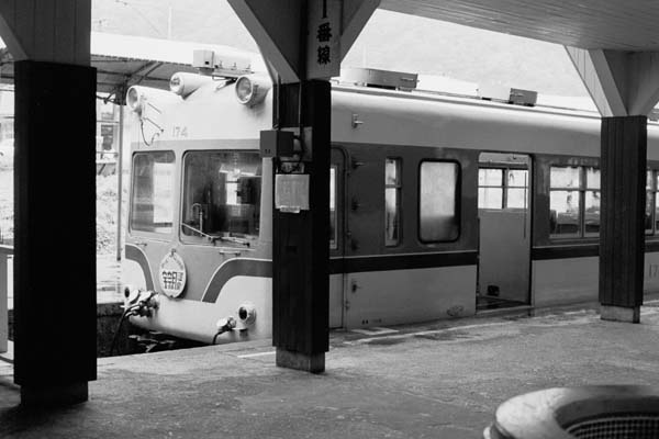 長野新幹線はおろか上越新幹線も当然未開通ですから、首都圏から北陸に向かう ルートの選択肢、お金持ちは東海道新幹線での米原経由、周遊券命の貧乏鉄達は 上越線経由の能登、信越本線経由なら妙高など、夜行急行のハザでございました。 そこで、何時も同じじゃ詰まんないからたまにゃ違うルートで行こうってな事で考えて 選んだのが、黒部立山アルペンルートなる世界でも名立たる山岳観光ルートでした。 現在このルートの片道ノーマル運賃が、信濃大町〜富山でナント\10.560ですから、 昔だってそれなりに高額運賃だったはずなのですが、どんな乗車券を使っていったか マッタク覚えておりません。ノーマル運賃ってなことたぁないのは確かなんですけどね。 しかも期待のアルペンルートは土砂降りの雨と厚い雲に覆われ、案内のテープ放送が 虚しく耳に響くだけでございました。そんなこんなで、ようやく着いた富山地鉄立山駅に 停まっていたのが、三つ目時代のクハ147「アルペン特急」宇奈月温泉行きでした。 地鉄立山線 立山 1976-8 |