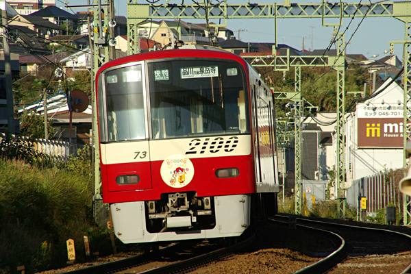 見つからず、ヘトヘトになり辿り着いた金沢文庫から品川方面に2つ目の踏み切りは、 架線柱串刺しなんか屁の河童っていうより、ラーメン架線柱命のアッシにとっちゃぁ、 下り列車を撮るにはマアマアのポイントございました。この踏切で下りの快特なんかを 撮って退散しようとした時、ラッピング仕様の2100系上り快特が通過して行きました。 その時空っぽの頭に閃いた!もしかしてヘッドマークも付いてるか!。んで、レンズを 最後部に振ったらございましたよ「旬香周島おきなわ」って、HMならぬヘッドシールが。 しかし、この時期日が傾くのが早い、このカットを撮ったのは15時前なのに、色温度は かなり低め、ってもしかして時代遅れのカメラのせい。嗚呼新しいカメラがホッシィ〜。 京急本線 金沢文庫 2013-11 |