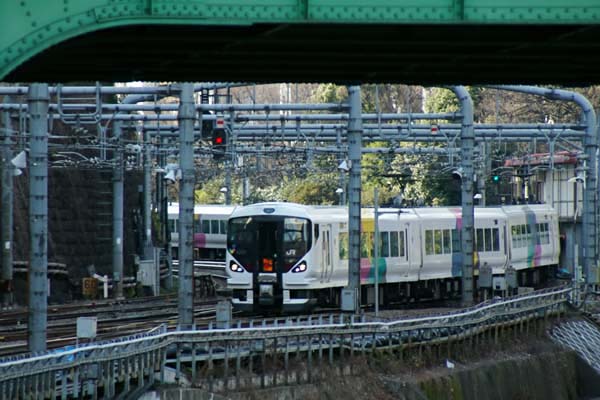 ました、今回のヘッドマーク探検団でございます。「かいじ」と言えば、昔急行時代に 115系なんぞを運用に当てて、遜色急行なんて有り難くないあだ名を頂戴しちゃった 基本新宿〜甲府間に運転される中央本線優等列車の愛称ですねぇ。平仮名で書くと 何の事だかイメージが、沸かない「かいじ」って、漢字なら「甲斐路」なんだろうけれど、 E257系の小っこいLED表示じゃ余計何のHMか分かんなくなっちゃう。しかし、特急に 格上げして、車両も国鉄時代の183からVVVFのE257に換えたって、今の「かいじ」の 停車駅考えりゃ遜色急行が、遜色特急に代わっただけじゃございませんか?写真の 東京発「かいじ」121号、ナント四谷に停まるんですぜ。これじゃ遜色特急じゃなくって 有料特快じゃんね。 中央本線 御茶ノ水 2005-3