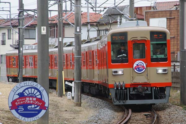 400両を切ってしまいました。そんな状況の中で、デビュー当時の車体色、オレンジに ベージュのツートンカラーに塗り替えられた8000系が、越生線に走っていると小耳に 挟み、行って参りました。デイタイムの越生線ダイヤは、約15分ヘッド4運用ですから、 坂戸駅出発待ちレギュラーカラーの8000系を除くと残り3運用、当りの確率1/3という 楽勝数値でございました。早速ホーム先端から次発の入線を待つも、現れた編成は 通常編成、その次に進入して来たのも通常色の白に青帯でございました。こうなると 本日の旧色編成8000系は、本線寄居ローカル運用だけなんて微かな不安が過るも、 3本目の8000系は駅を出て最初の踏み切りで撮る事となりましたが、架線柱乱立に 御覧のような悲惨な結果となりました。その串刺し写真唯一の収穫が、東武にゃ稀な 結構な大きさの「鉢形駅リニューアルオープン」真丸ヘッドマークでございました。 東武越生線 坂戸〜一本松 2015-3