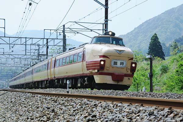 「臨時」なのでございます。今では走行シーンを見ることが出来なったボンネット型の 485・9系が定期のスジは失いなうも、辛うじて不定期のスジで稼動していた頃でした。 GWにボンネットの臨時雷鳥走行との情報入手、たまにゃ有名ポイントも良いかなっと 新疋田のカーヴへ参りました。流石に超が付く有名撮影地、日本海やらEF510やら 次から次へとカーヴを曲がって目の前を通過して行くのでございました。やがて本命 485・9系臨時雷鳥が新疋田駅に姿を現す、ボンネット先頭部には漢字2文字のみで 描かれたヘッドマークが、こりゃ昔ながらの懐かしい「雷鳥」のHMに違いないぞ、っと 思ったら大間違いでございました。列車との距離がだんだん縮まってくると「雷鳥」と 思い込んでいた2文字は、無情にも「臨時」の2文字だったのです。 北陸本線 新疋田 2008-5