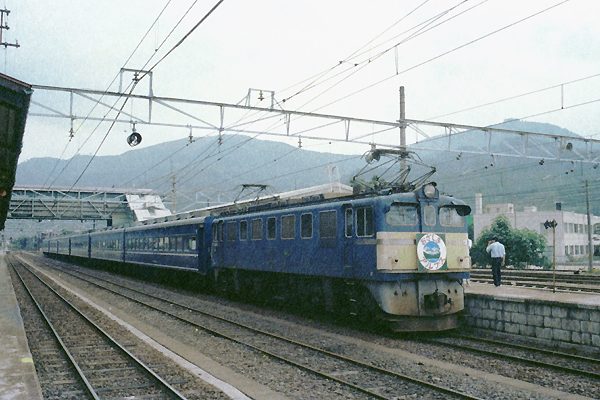 国鉄時代末期、「おざしきアルプス」てぇネーミングの臨時快速列車がございました。 HMファンの皆さんなら「アルプス」って言やぁ、中央東線を客車から気動車、電車まで 様々な車両が、昼行夜行臨時に季節で走った急行列車を思い出しちゃうますよねぇ。 なので、「おざしきアルプス」お察しに違わず、中央東線を走った列車でございました。 しかし、80年代も国鉄時代が終りを告げる頃なんで、急行アルプスのスジは臨時も 定期もほぼ列車番号の末尾にMが付いた電車列車でございました。そんな面白みの 無い運用バッカだったアルプスの中で鉄の人気を集めたのが、「おざしきアルプス」で ございました。運転区間は下り夜行逗子〜白馬、上り昼行信濃大町〜逗子っときて、 大糸線内はED62が、頭に来てスロ81を牽いて走るんだもん、コレで人気が出なきゃ、 C56でも頭に持って来るきゃありませんぜ。 大糸線 信濃大町 1985-8