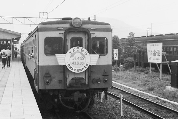 今から半世紀も前の事、年金貰って鉄してる思鉄面々が、未だ中高生時代のお話で ございます。その頃は東京近郊はモチロン、都心だって蒸気機関車が走ってんとこを 見られたんです。その中でも小田急で行けた、御殿場線にゃ飛びっきりデッカイ カマ D52が、本州で唯一走っておりました。その御殿場線も1968年7月1日全線電化完了、 前日の6月30日にゃお別れのヘッドマークを付けたD52の最後の力走で沿線や駅は、 沢山の鉄で大賑わいでございました。しかし、御殿場線を走ってたのは、D52だけじゃ ございません。旅客列車の半分以上は、10系気動車の運用でございました。コチラも 電化となりゃ、当然用無しの憂き目でございますが、そこは鉄の老舗友の会、DCにも 友の会で立派なHMを作成致しました、その「さよなら」のHMを付けた気動車も最後の 仕業に勤しんでおりました。 御殿場線 山北 1968-6