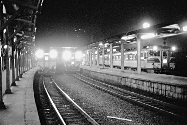 漆黒の闇の中煌煌と灯りが燈る函館駅、鉄が一人ホーム先端の方へ向かい編成の 切れた辺りで振り向く、カメラを構え停車中の列車を撮影いたしました。ってなことで、 今回のヘッドマーク探検団は、その鉄=松原の親方がスナップした写真をアップです。 昔々の機材なんで手振れ防止なんて洒落た機能なんざぁ無いんで、シャープ強めに 掛けてもチョイ難有りだけどお許しを。さて、ホームに停まっている3本の列車の内で 右と真ん中の列車が、今回のHM探検団のお題でございます。だけど、肝心のHMが ハイライトとシャドーばっかしの夜撮で、白飛びしちゃてっから肝心の列車名が、何が なんだかサッパリ判んねぇや。って言われちゃうから、キハ82の愛称名調べましたよ。 先ず写り込んでる時計をヒストグラムを弄くるてぇっと、04:30って時刻がナントカ確認 出来ちゃいました。時刻さえ判りゃ後は当時の時刻表を捲るだけでございます。幸い 撮影同月の北海道時刻表が、あったんで早速確認するてぇっと、右っ側のキハ82が 04:45発1D特急「おおぞら1号」釧路行き、真ん中のキハ82は04:50発11D特急「北海」 旭川行と判明いたしました。ちなみに、左のHMが付いて無いキハ56は、0505発101D 急行「ニセコ1号」札幌行きでございます。モチロン撮影後松原の親方が乗ったのは、 北海道週遊券だけで乗車出来た「ニセコ1号」でした。 函館本線 1973-2 |